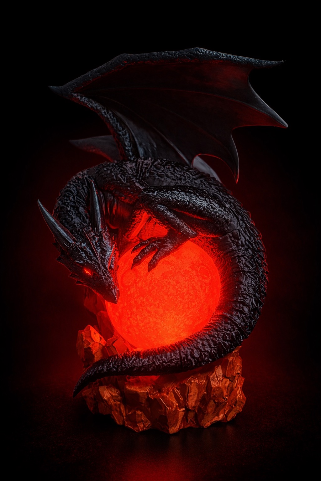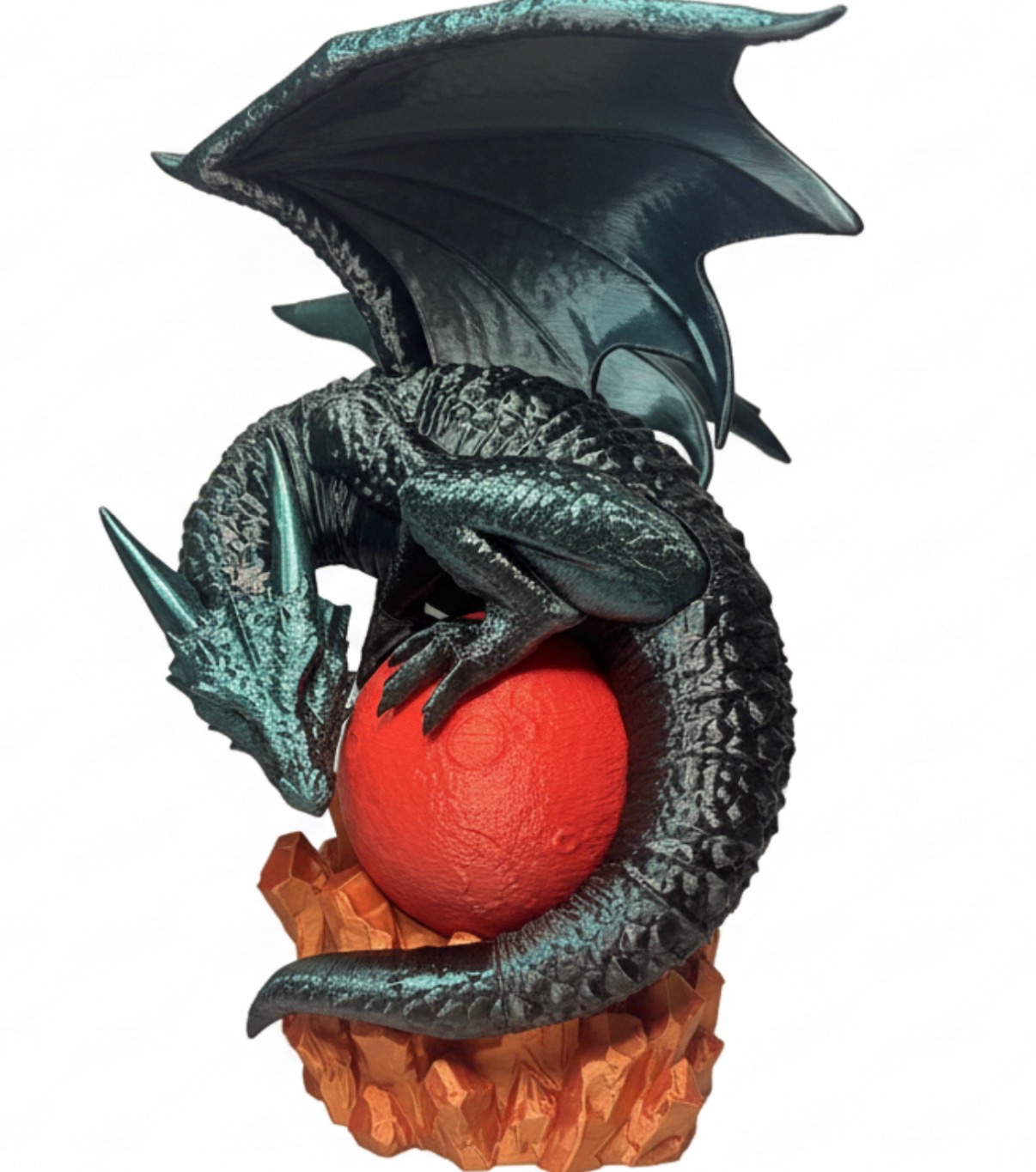 Unleash the power of fantasy with this breathtaking 3D printed dragon lamp—where art and light collide. Perched majestically atop shimmering crystal rocks in radiant shades of orange and gold, the dragon spreads its enormous wings in a striking display of strength and elegance. Its deep green and black body contrasts beautifully against the glowing red orb it fiercely guards, while its piercing red eyes bring an intense, lifelike presence to the piece.
