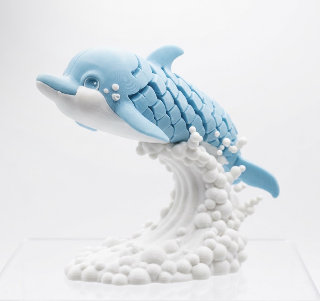 Bring a splash of ocean charm to your space with this adorable 3D printed dolphin figurine from MacMakers 3D. Captured mid-leap above a stylized wave, this design blends smooth curves with textured details for a look that feels both whimsical and polished. The soft blue tones and friendly expression make it an instant mood lifter on any desk, shelf, or display.